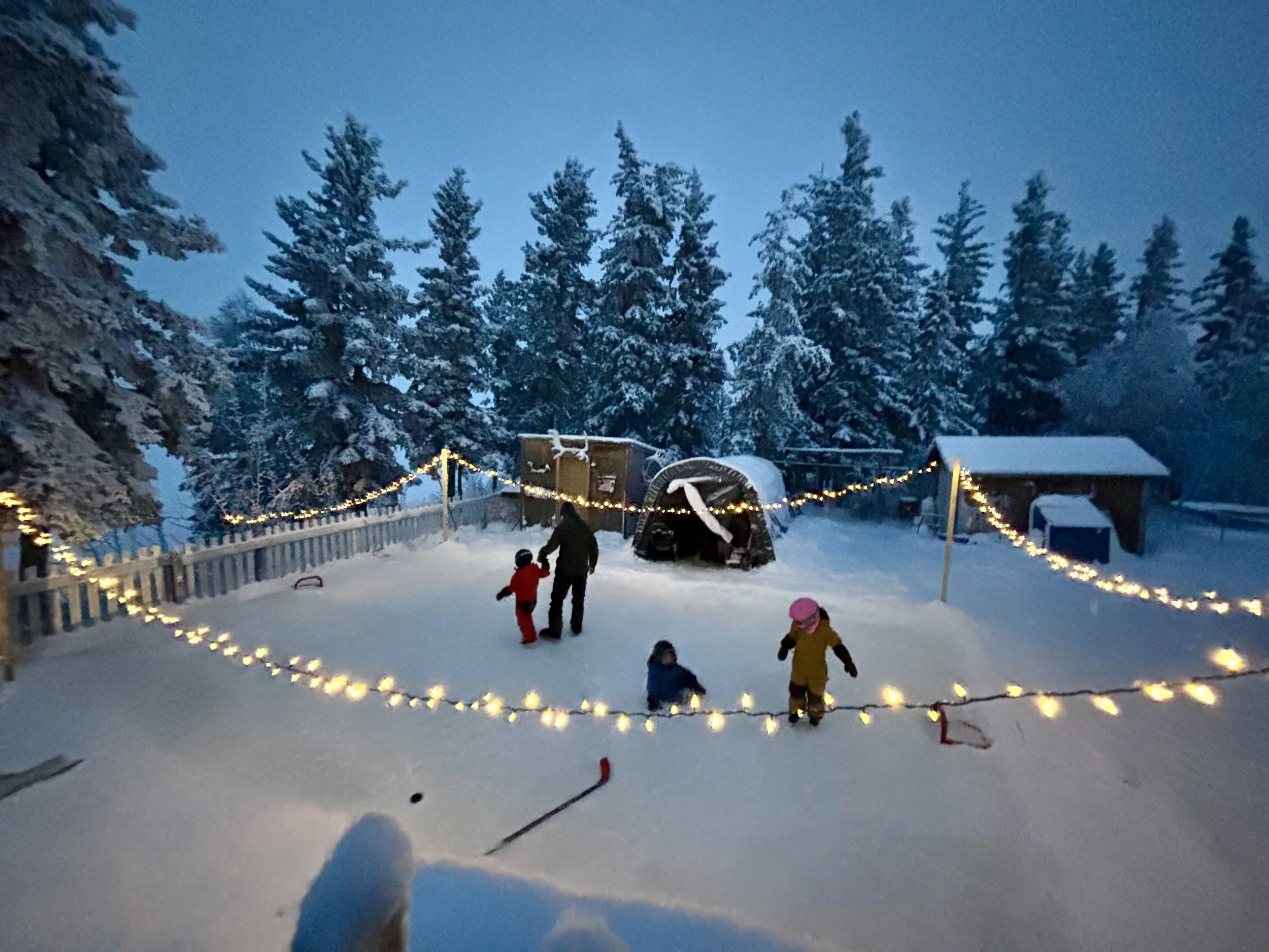 Josh built the family a backyard rink for Christmas and the kids got outfitted in hockey gear. The blurry picture is courteous of freezing temps and an ill-prepared mother.